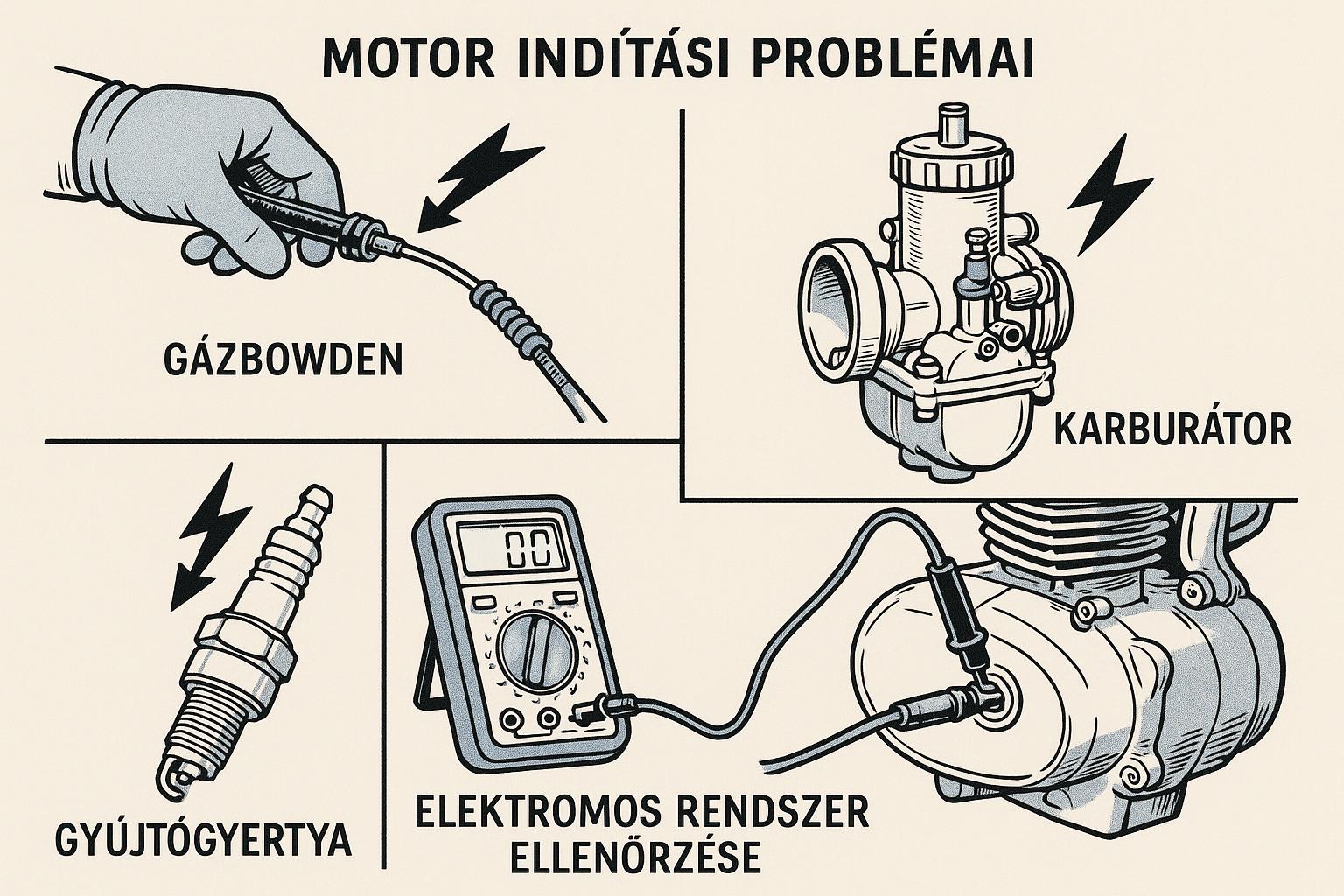 Rengeteg baj forrása egyszerű szennyeződés vagy laza csatlakozás lehet. Karburátor tisztítás, gyertya csere, légszűrő átfújása, bowden kenés vagy beállítás – ezek mind otthoni feladatok. Az interneten sok fórum és videó segít, de érdemes akár letölteni a típus szerelési útmutatóját is.