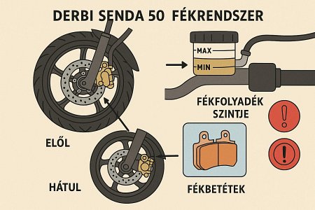 A fékrendszer hibája mindig veszélyes. A Derbi Senda 50 általában elöl-hátul tárcsafékkel szerelt. Ha elkopnak a fékbetétek, csikorgó hangot adhatsz fékezéskor, és gyengébben fog a fék. A fékfolyadék szintje és minősége szintén fontos. Ha levegő jut a rendszerbe, puha lesz a fék, és rosszul fog. A tárcsa görbülése rázkódást okoz fékezés közben. Minden fékgondot gyorsan meg kell oldani a biztonságos közlekedés érdekében.